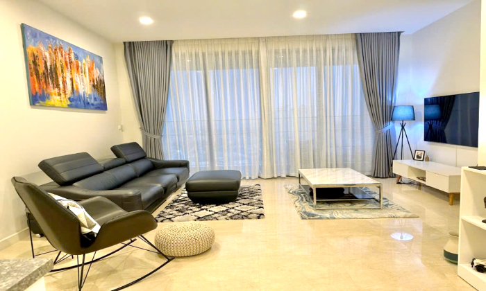 The apartment is designed in a sophisticated European style, complete with curtains and large windows that provide ample natural light. It offers direct views of the Saigon River and the vibrant urban landscape from both the living room and bedrooms.